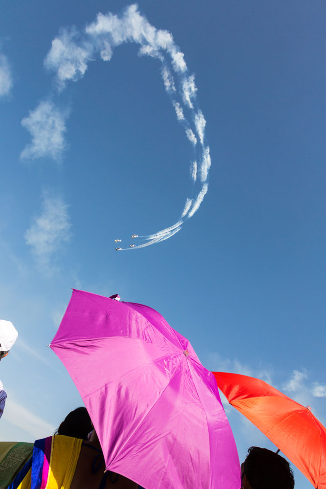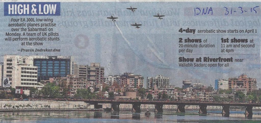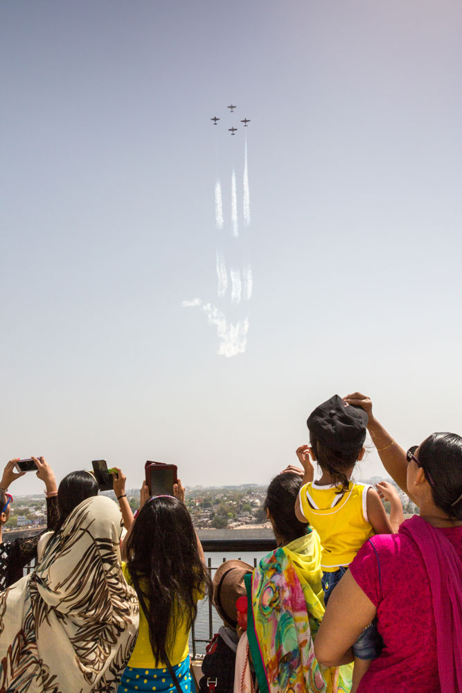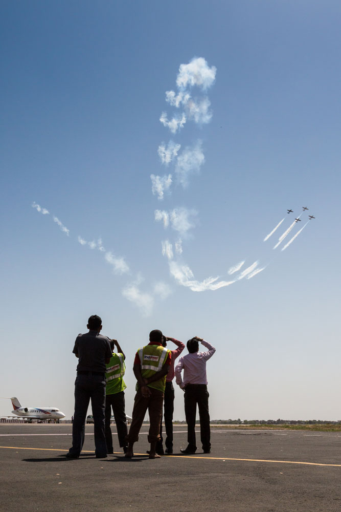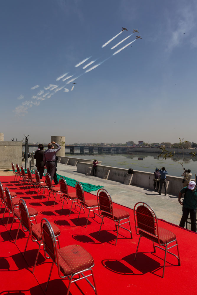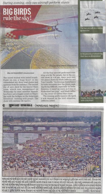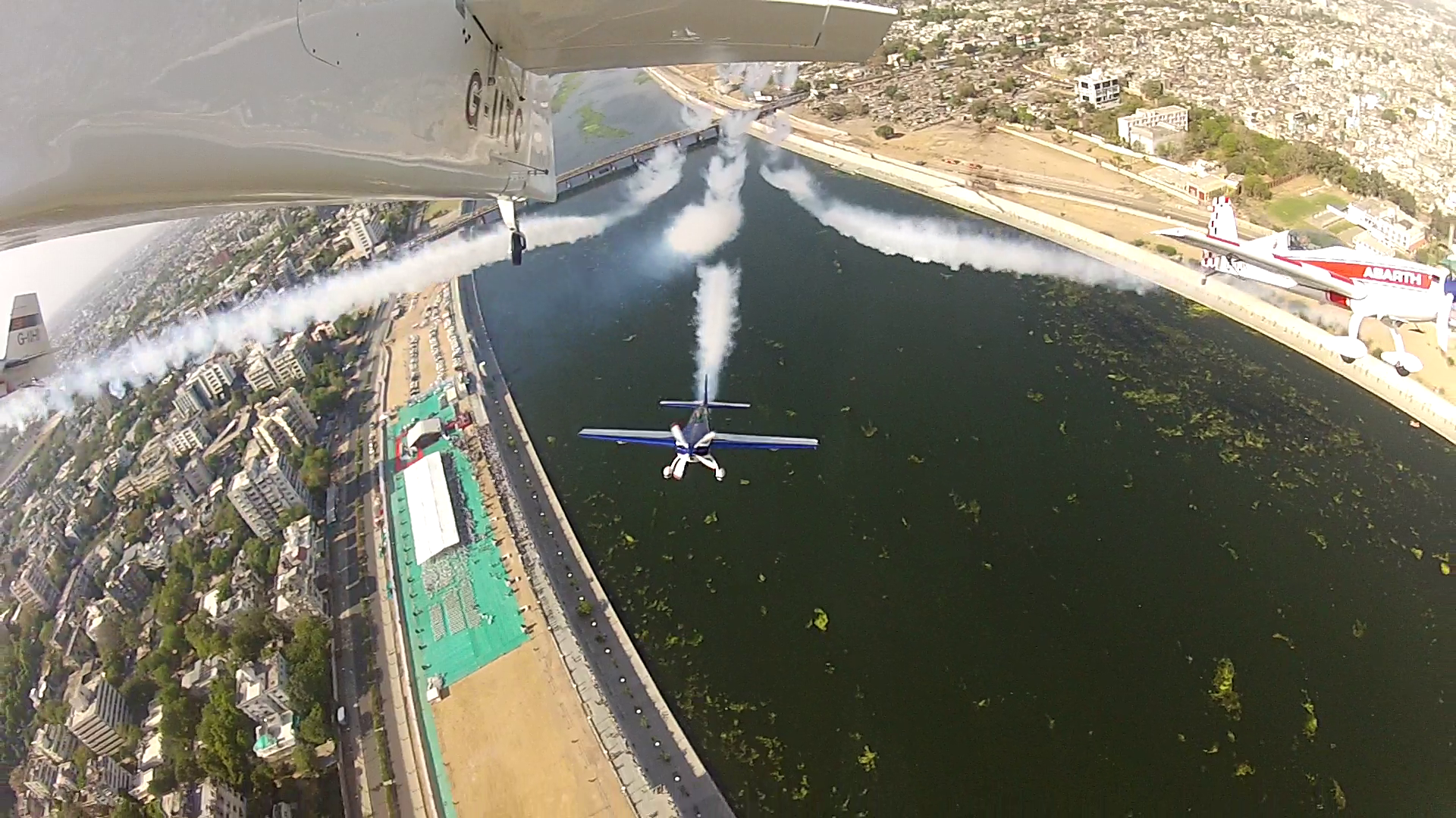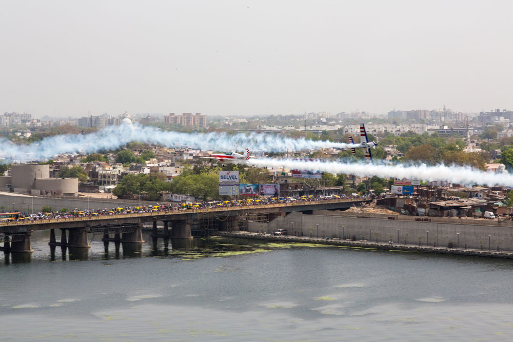 The show is officially opened 30 seconds before we tip in at precisely 16:20. The ATC at Sardar Vallabhbhai Patel International Airport do a sterling job of calling the opps desk of all inbound airlines in the preceding there flights to make sure they arrive early and on the ground buy 16:10 thus allowing us to take the airspace for 10nm and 4,000ft around the airport. 16:10, taxi, 16:15 cleared for take-off, 16:20 tip in, everything goes to plan. In the afternoons its just a bit more bumpy but the formation manages to take this in its stride. 4;30 formation the a break to fly the big heart, 4;30 solo by myself then we join up again for a further 4:10 formation and then low flypasts. The crowds went wild, with many email congratulations and twitters (@airdisplays). The team head out to the cultural evening ASAP.