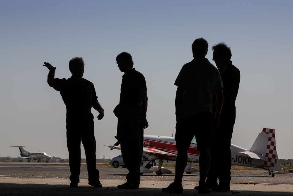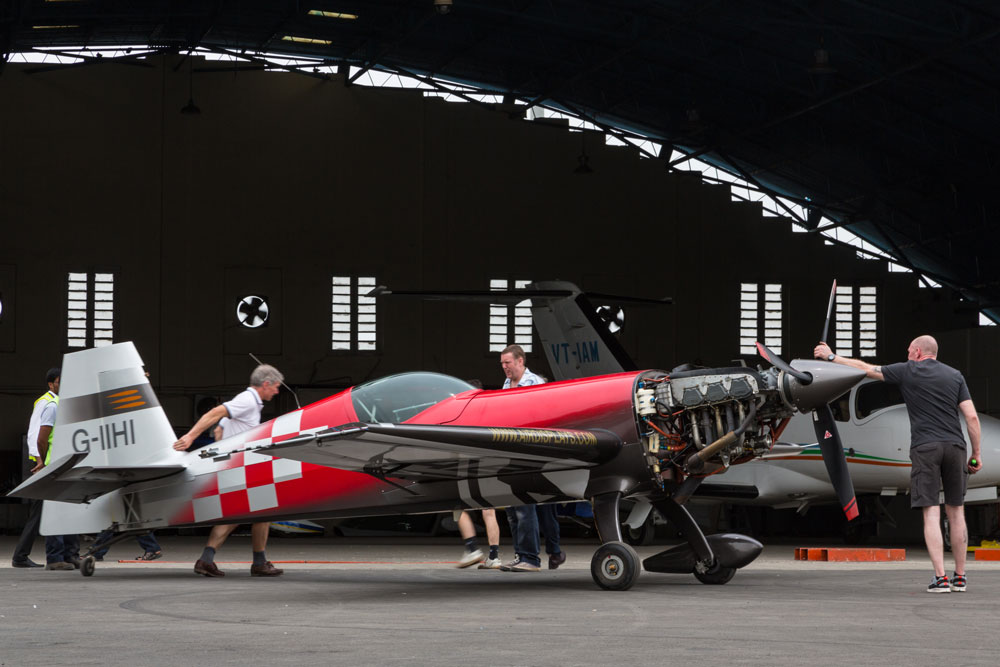 The last few items on the planes are done whilst the remainder of the team fuel all a/c. Tom takes a briefing from the tower. Ground runs are carried out, I find the alternator not working but have enough battery for engine start and a flight. We practice over the field, well this is an International airport with scheduled airline arrivals and departures so its imperative we are ready and stick rigidly to the timings given in the NOTAM. We have a short flight over the field then down the river to the display venue, a couple of teaser fugues flown there and back to base. All goes well. I have to have fix the charging issue, cowls off and investigate the cause of the non charging, changing regulator, changing alternator, turtle deck off and then we find a broken terminal connection. Job done with 25 mins spare. Quick walk thru again and we push planes out, just about to saddle up and the wind direction changes, dust is seen in the distance and within moments viz drops to 1KM. planes back in the hangar and that’s it for the day.