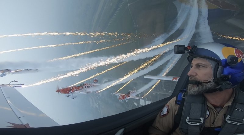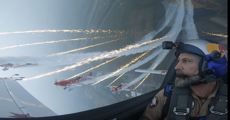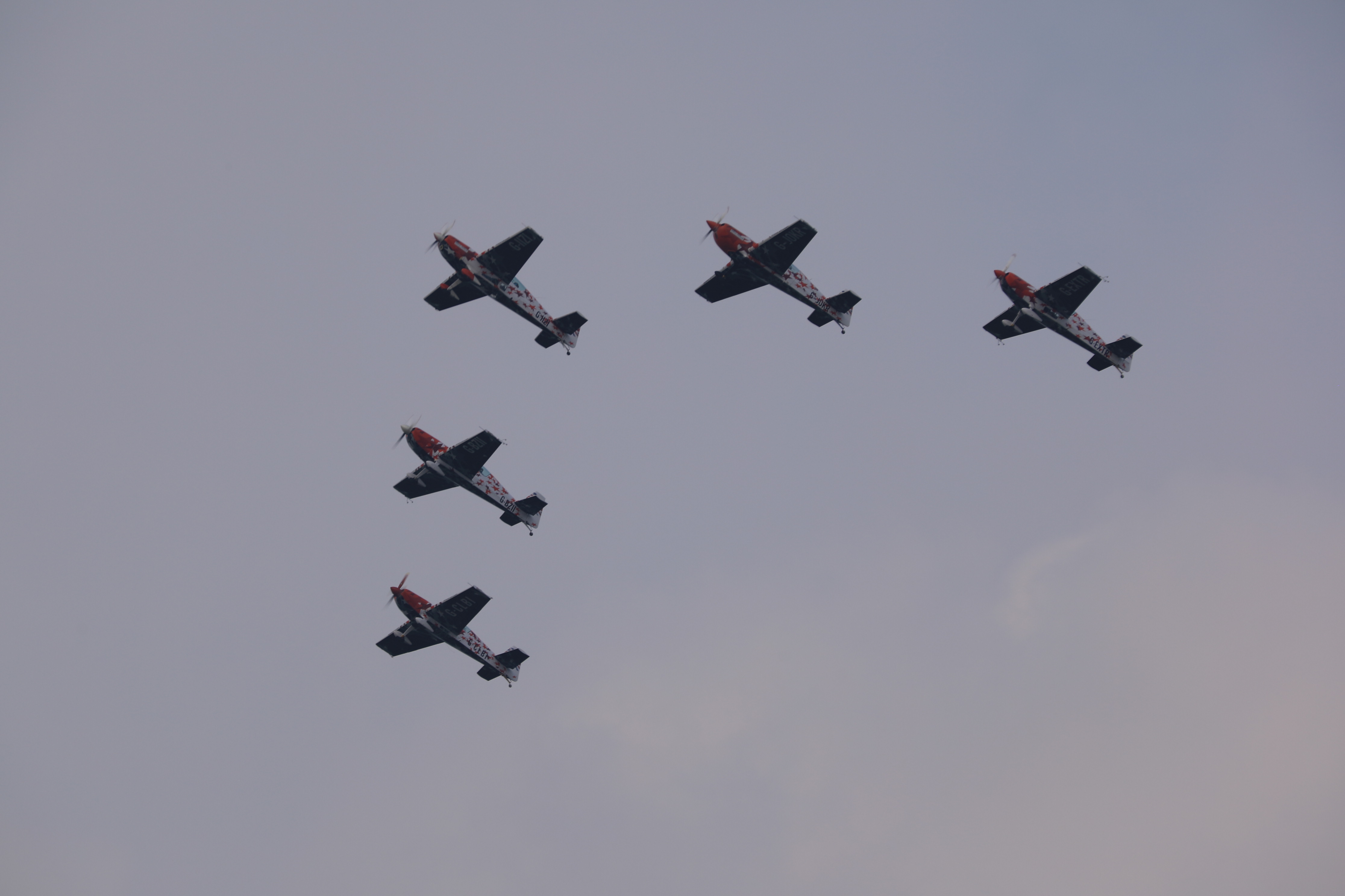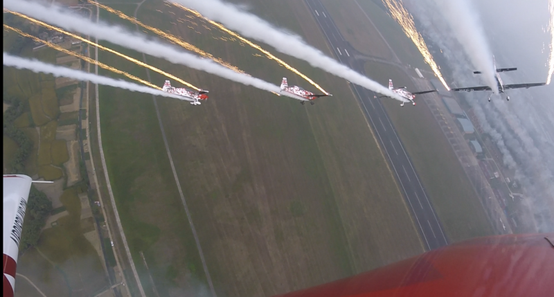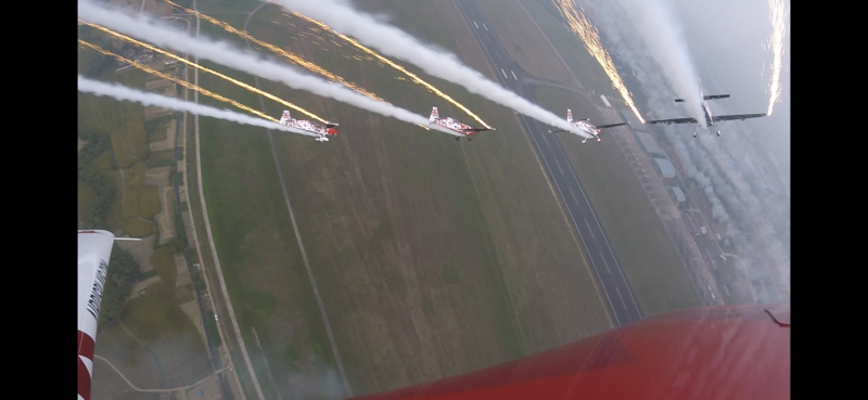That fifth element makes quite a difference to the overall visual density as the formation can be changed to “Apollo” for instance in which 4 and 5 slide across behind 2 and 3 using rudder. Put 5 into “Box” position and hang 4 off the back, and you have “Arrow”. The view from 4’s position with the pyros lit up is quite impressive!