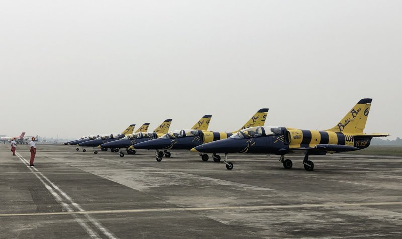 The team flew a variety of display profiles in the first four days of the exhibition, day formation, pyro formation, solo and pyro slalom. Five days of shows in addition to the practice days is quite a lot of flying by anyone’s standards. Long days indeed, leaving the hotel at 0900 to prep’ the aircraft, fly the display, prep’ the aircraft again, then wait around to do it twice more.